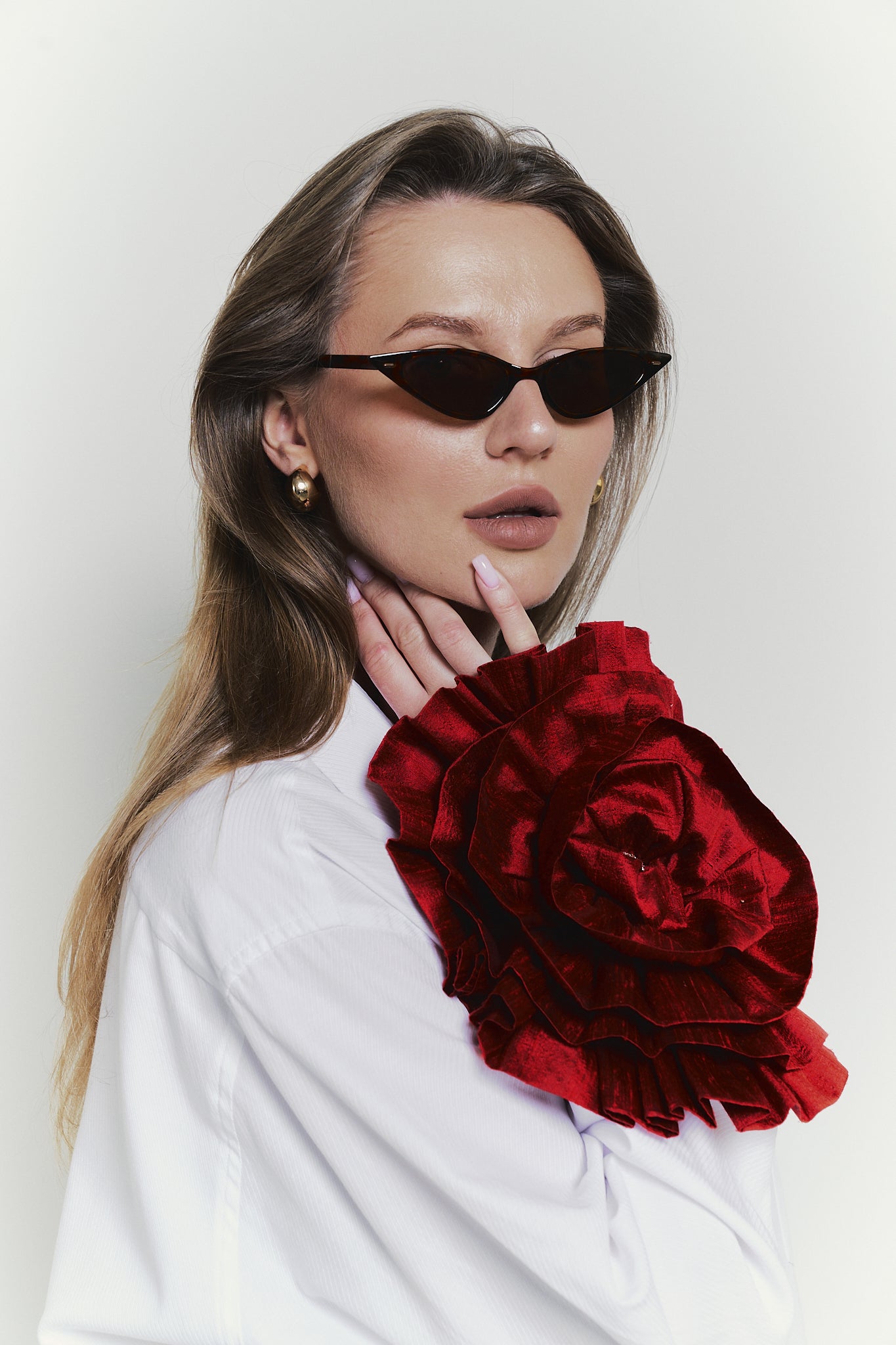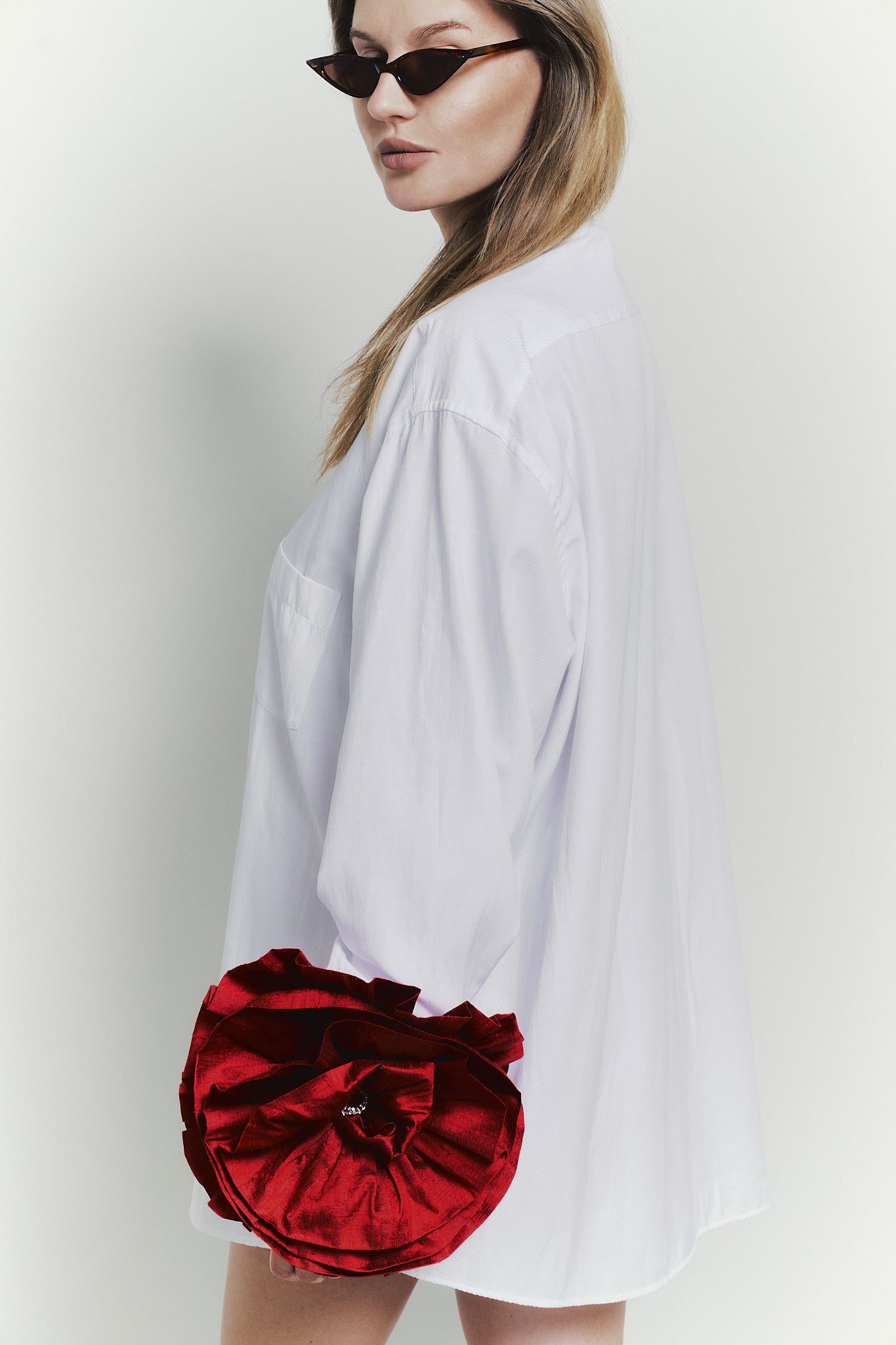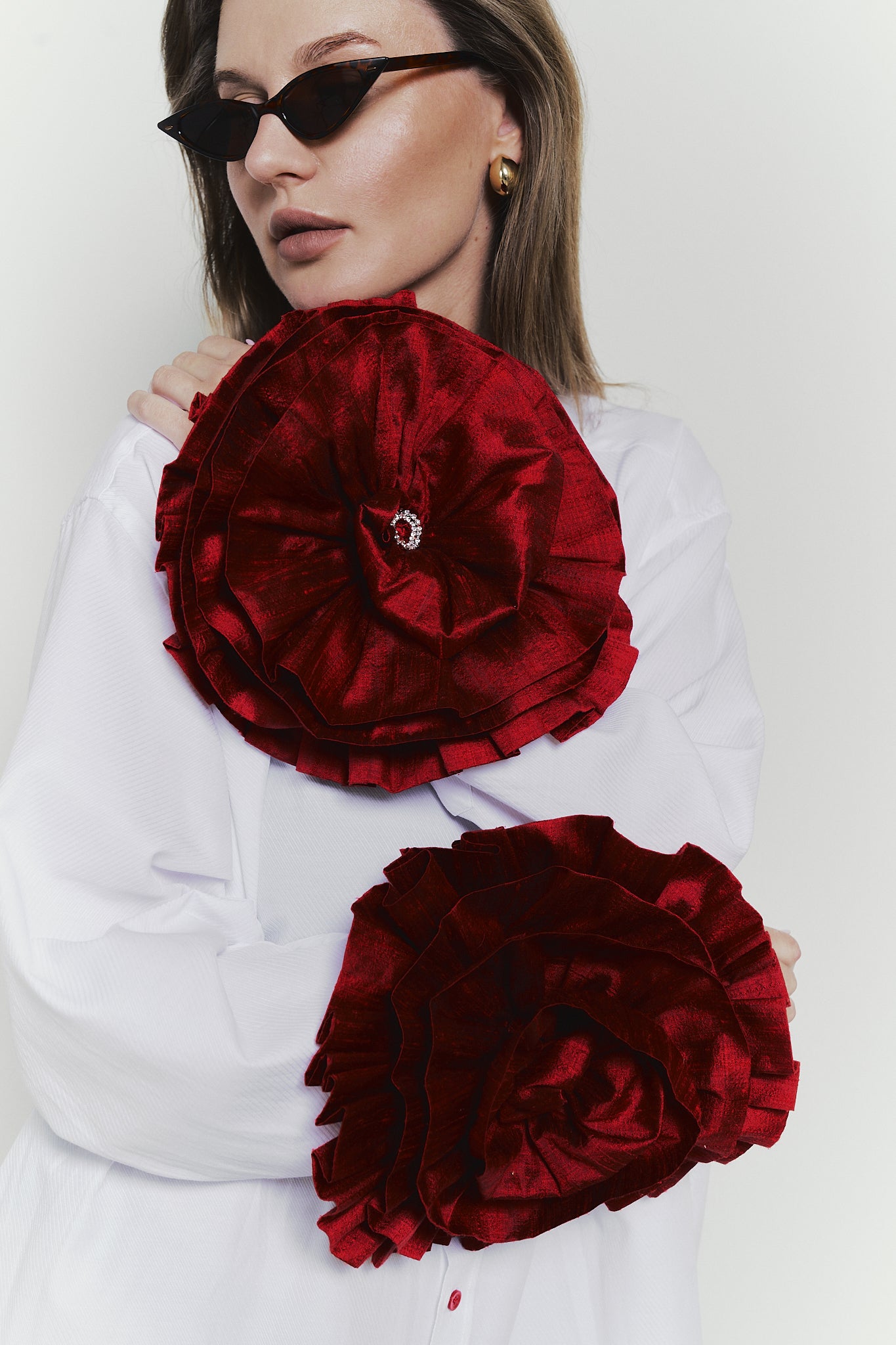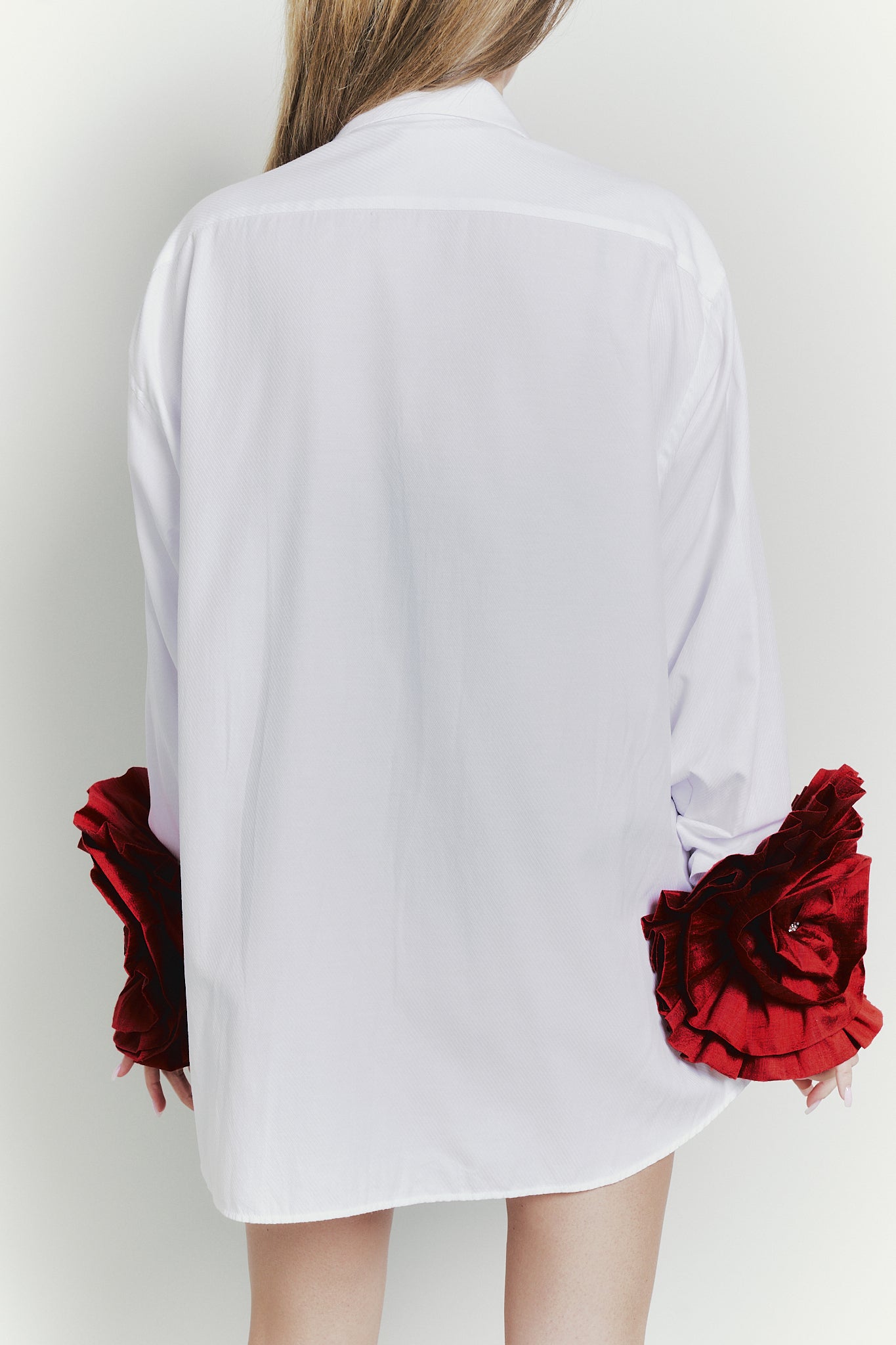 Experience the beauty of sustainability with RED MOON. Our 100% upcycled white cotton shirt features red flowers stylishly removed from the sleeves, making it an outstanding addition to your wardrobe.