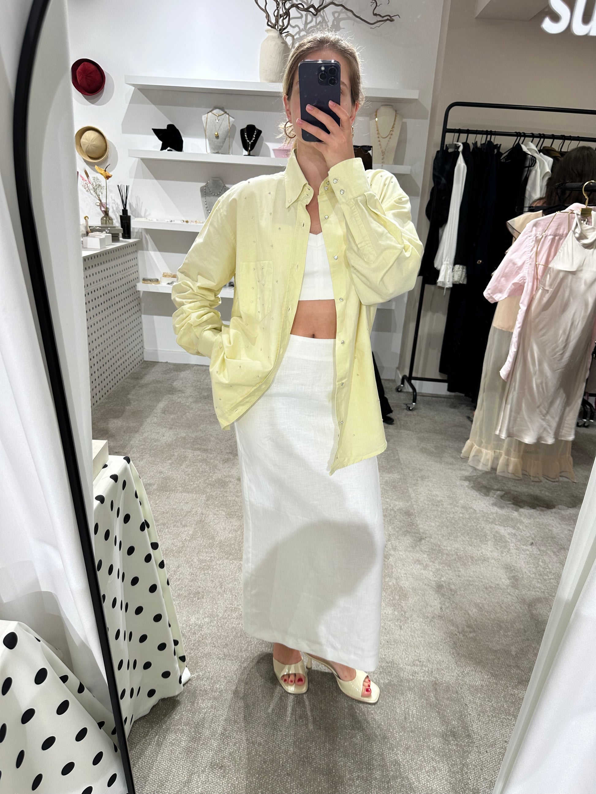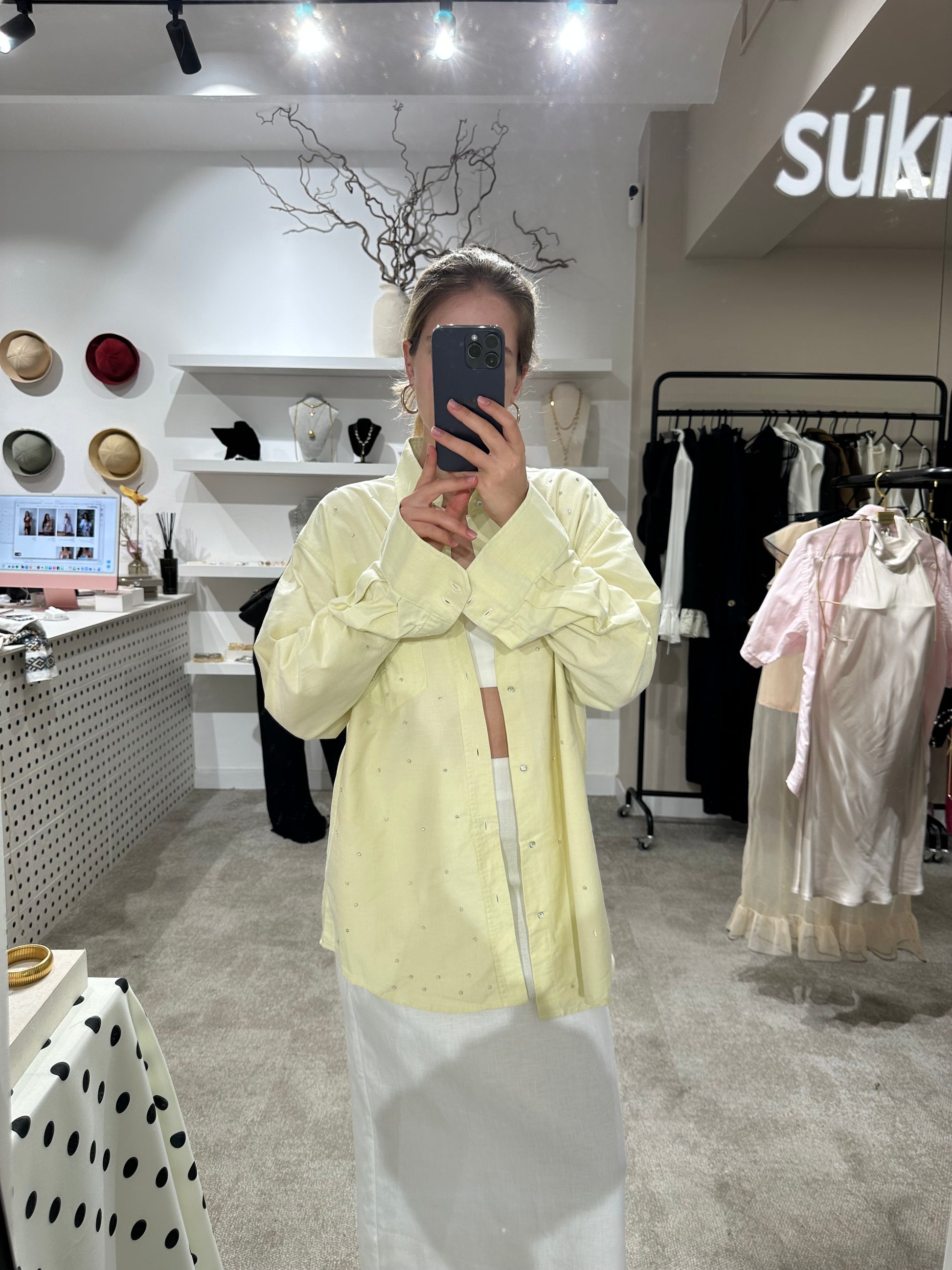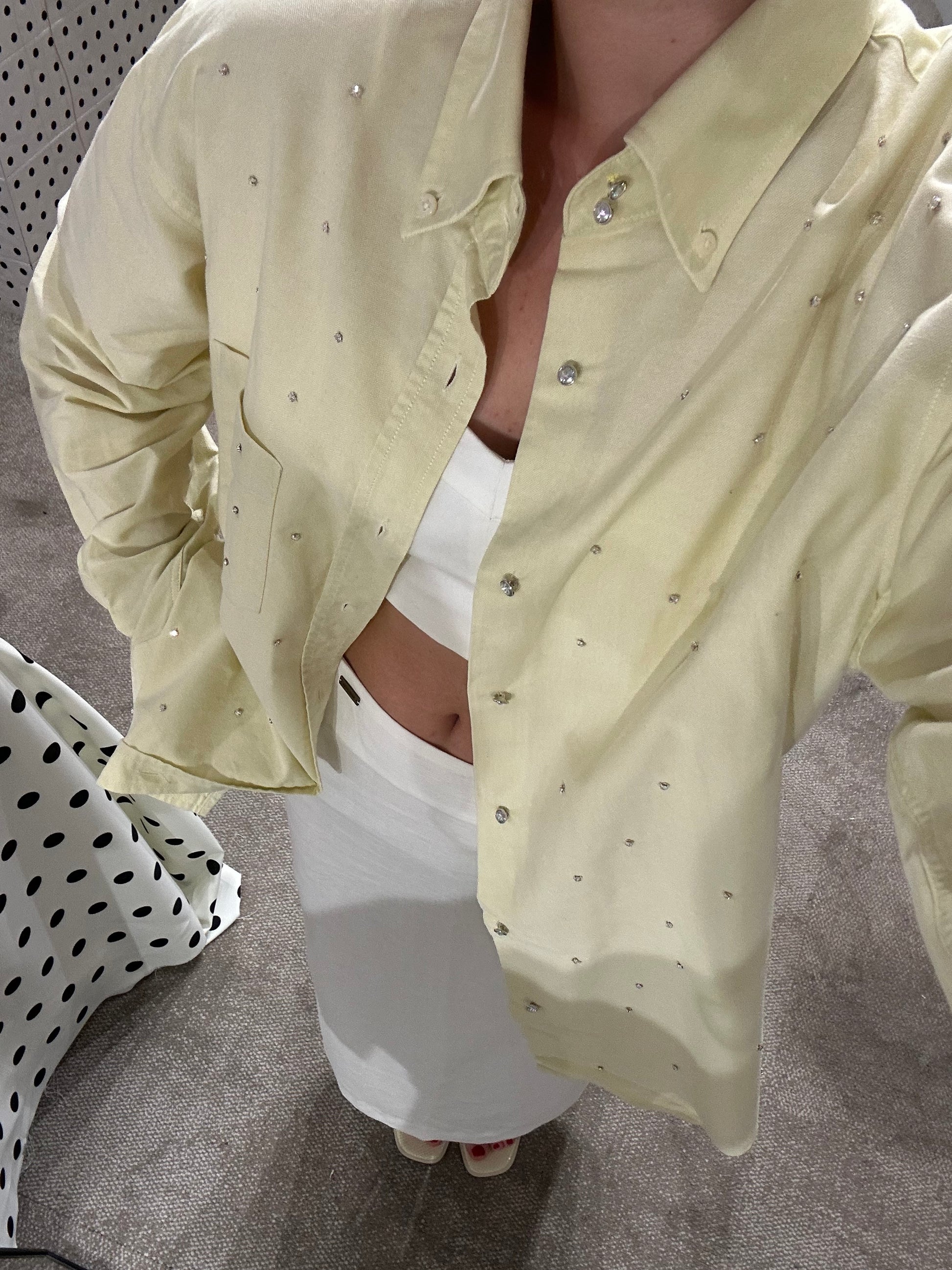 Introducing our COTTON SHIRT “GLITTER BUTTER” - a trendy lemon butter colored shirt made from high-quality cotton and adorned with sparkling Swarovski crystals. Stand out in style and comfort with this divine shirt.100% Cotton.