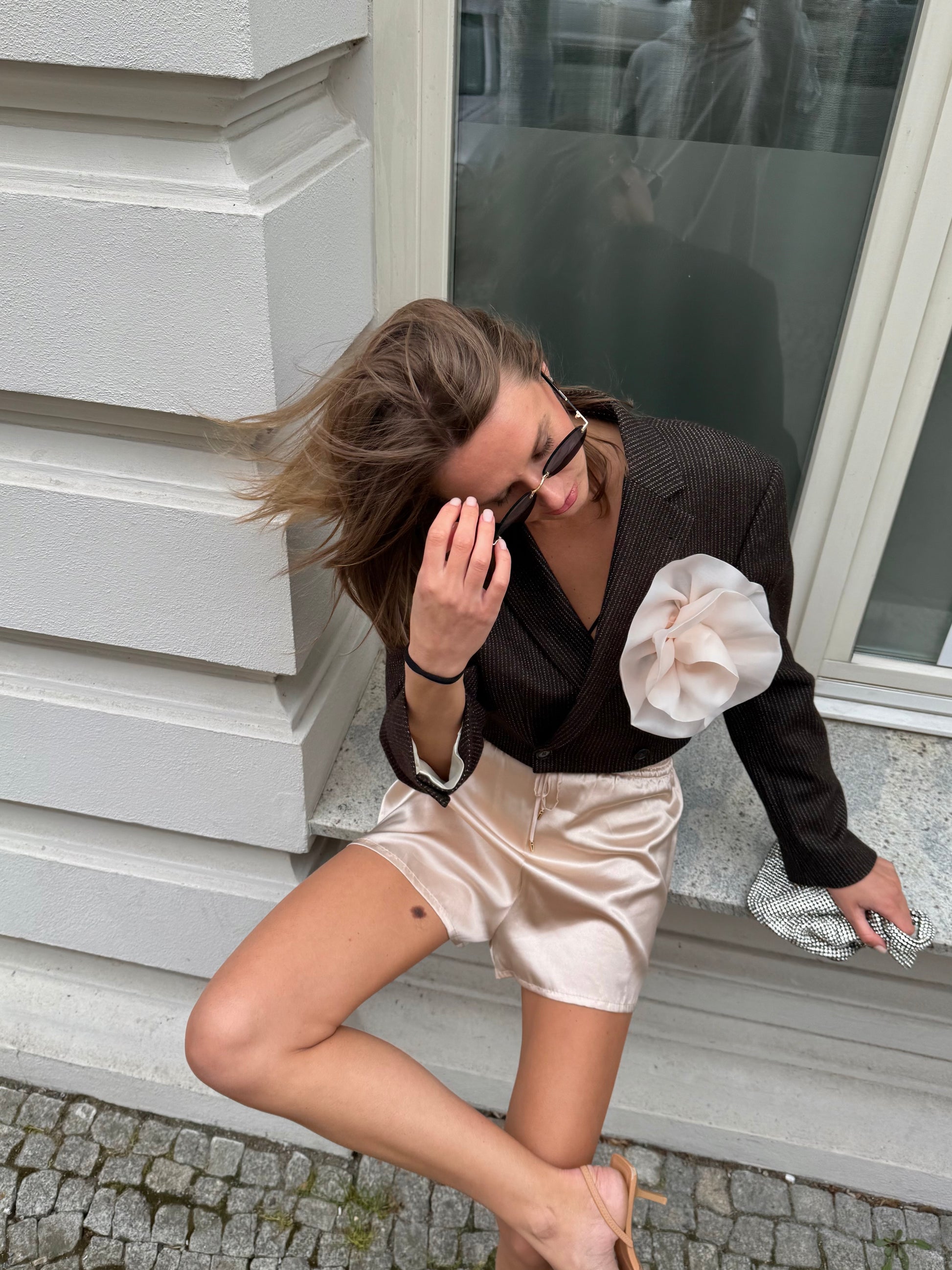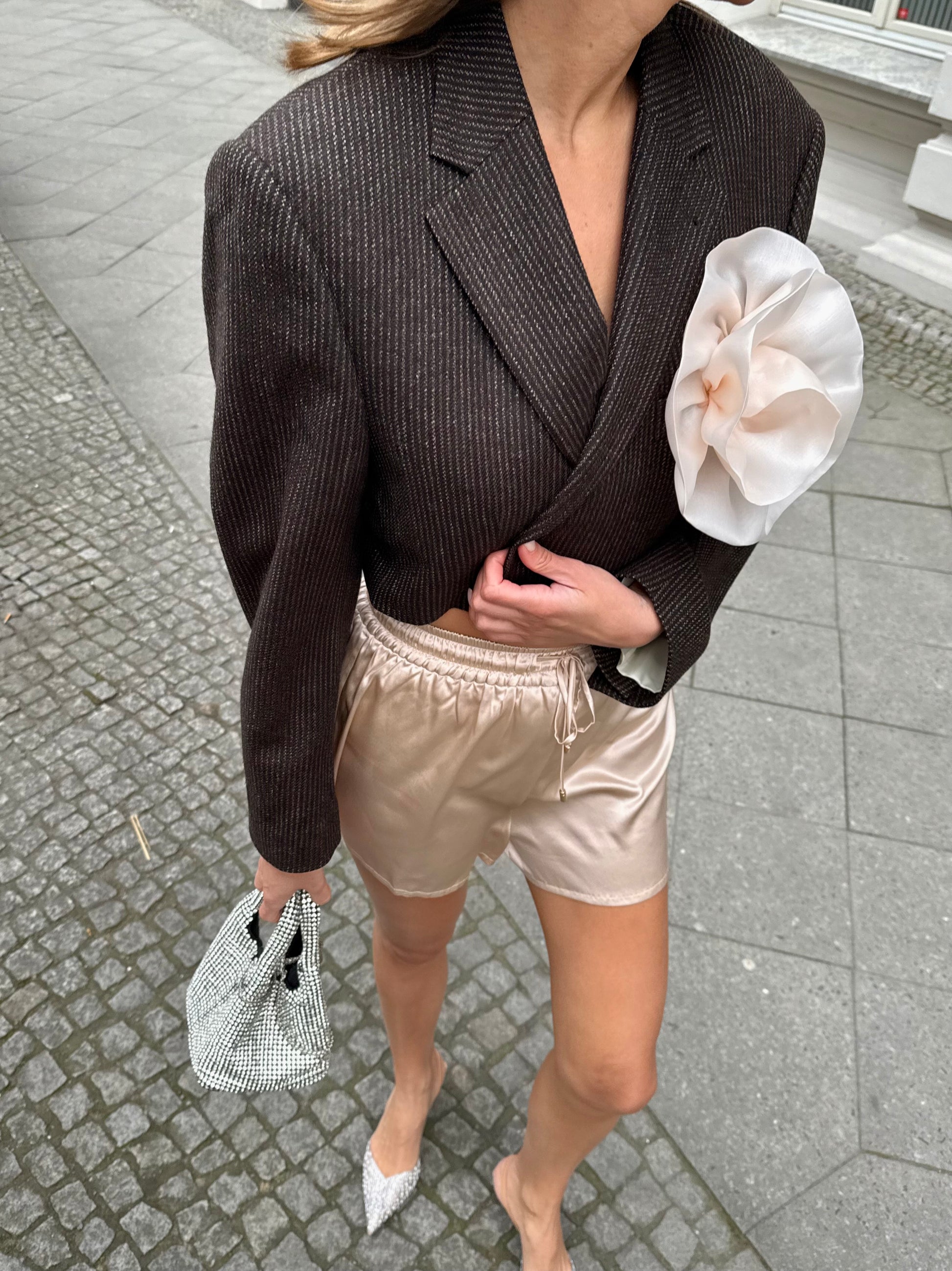 CROPPED BLAZER „KEIRA ROSE“ is made with 100% wool. The design adds a modern touch, while the flower brooch made of silk adds brings an elegance.