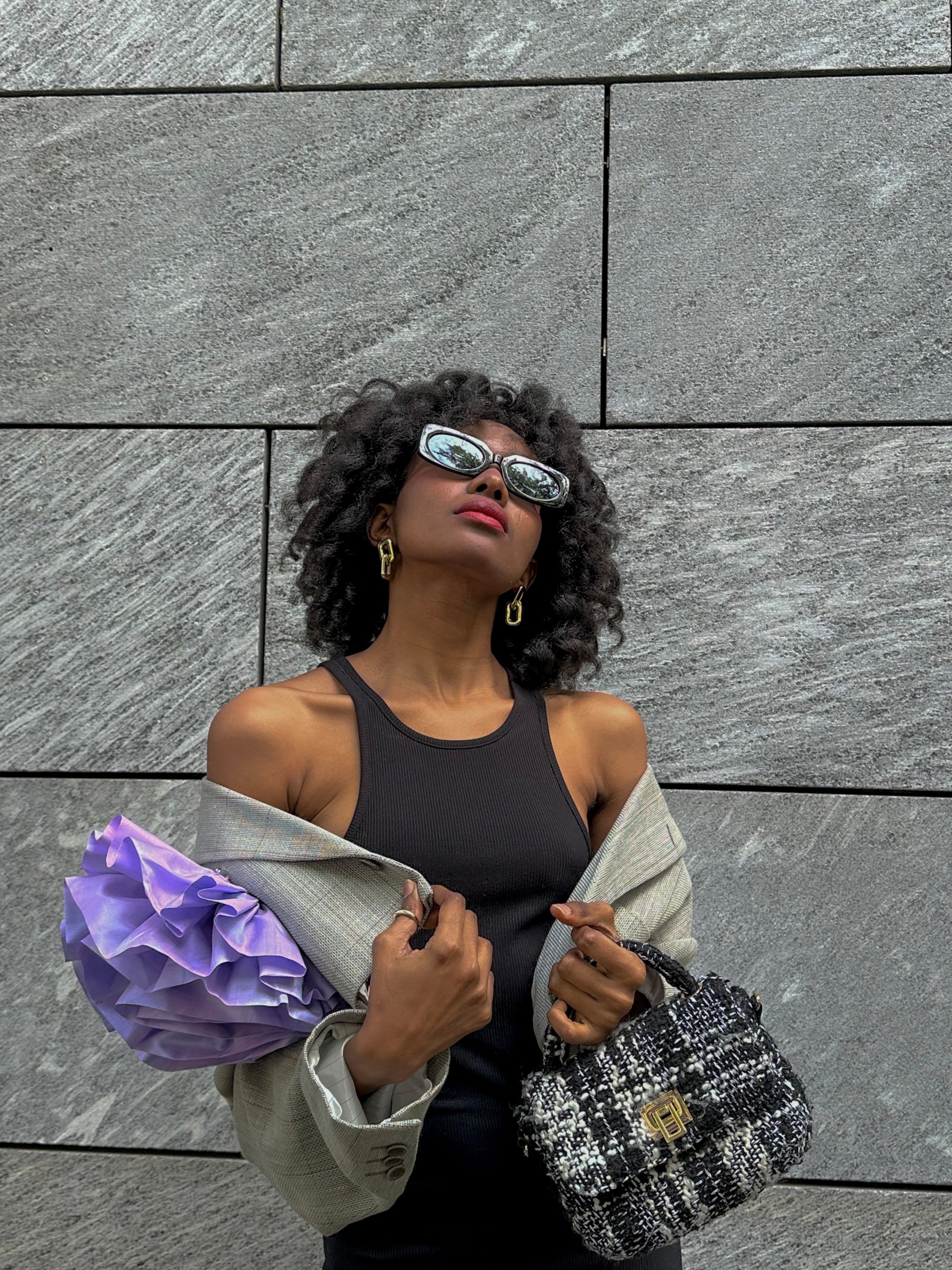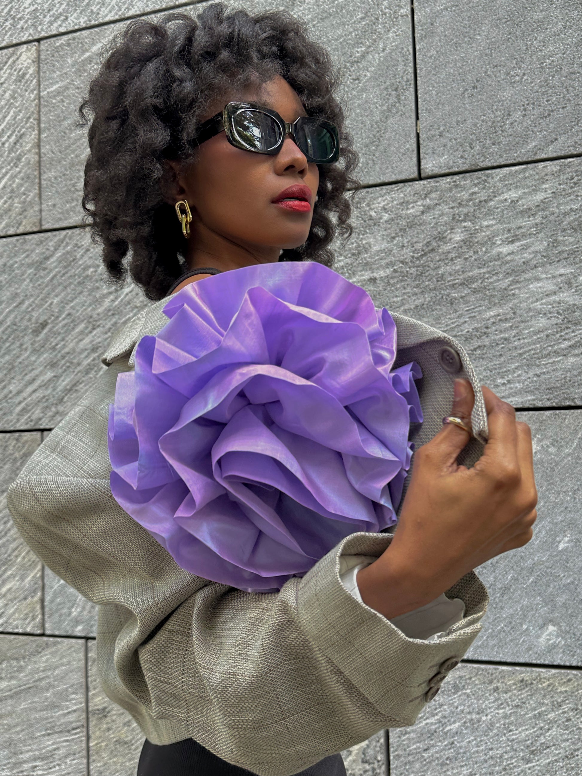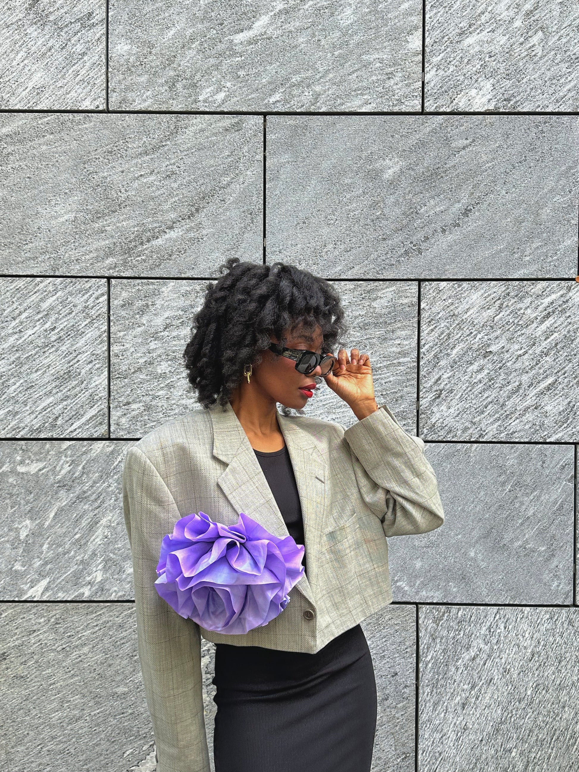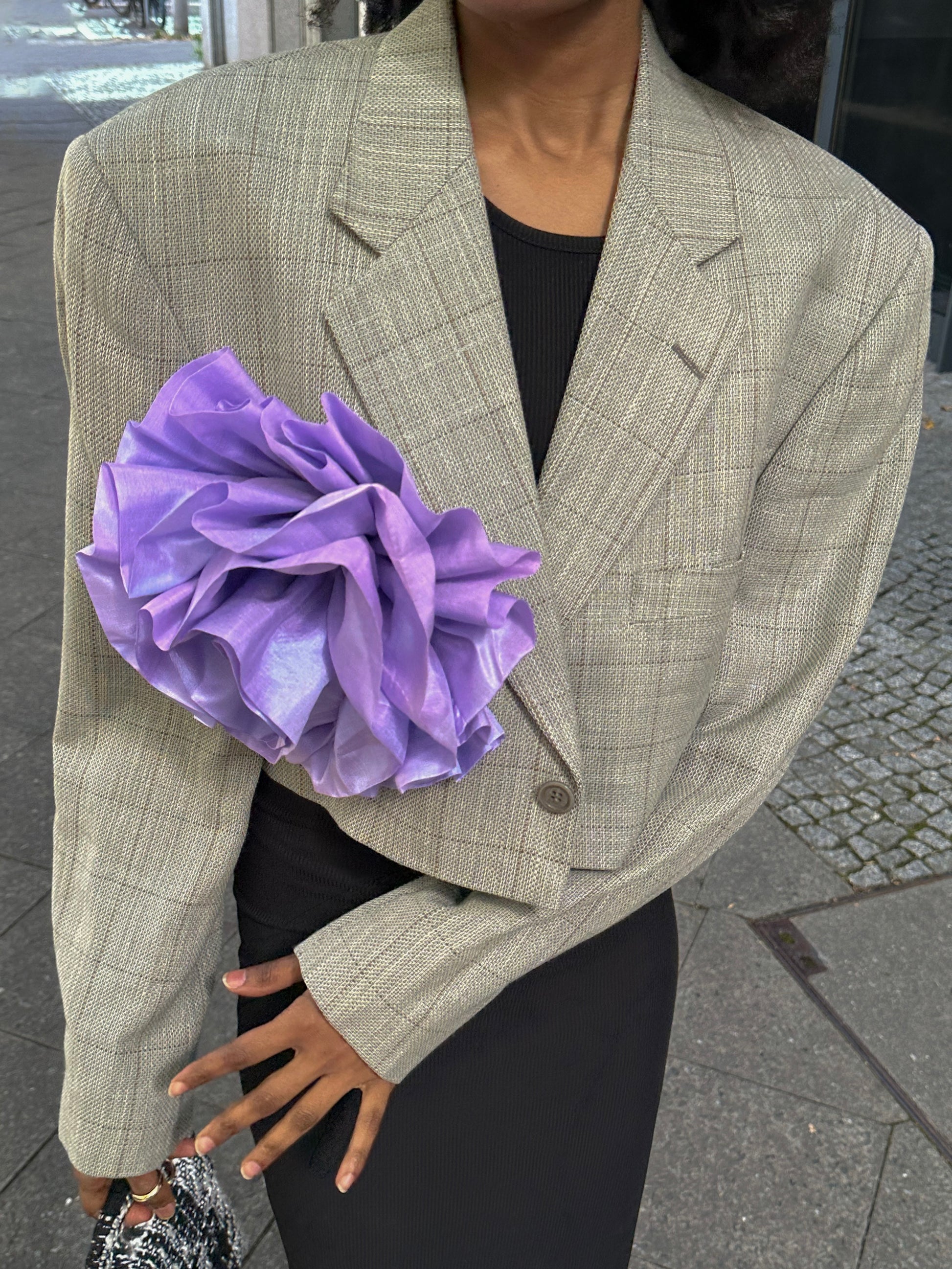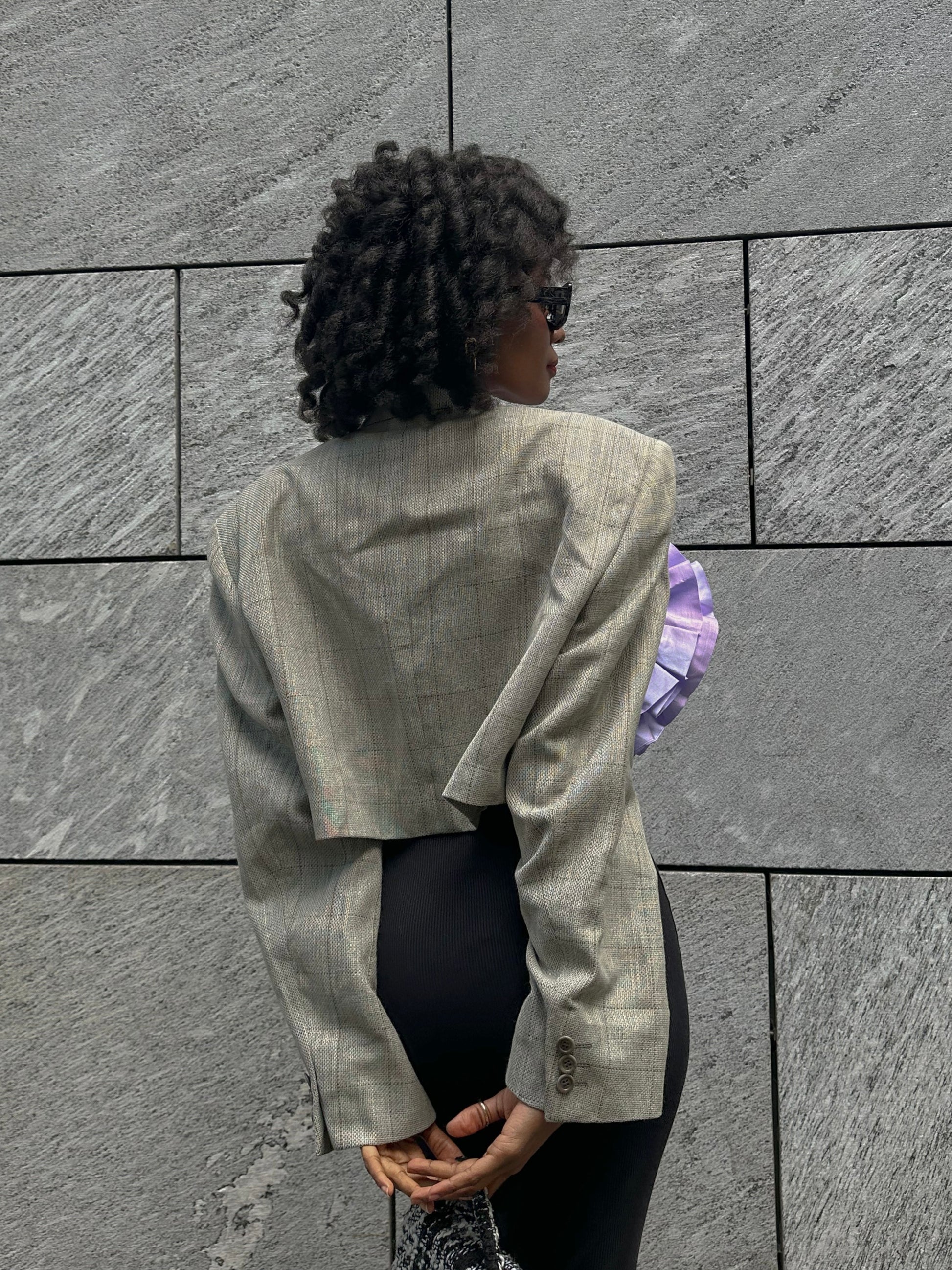 Get ready to slay with our royal gray cropped blazer featuring a weightless purple silk flower. Perfect for adding a touch of playful luxury to any outfit.