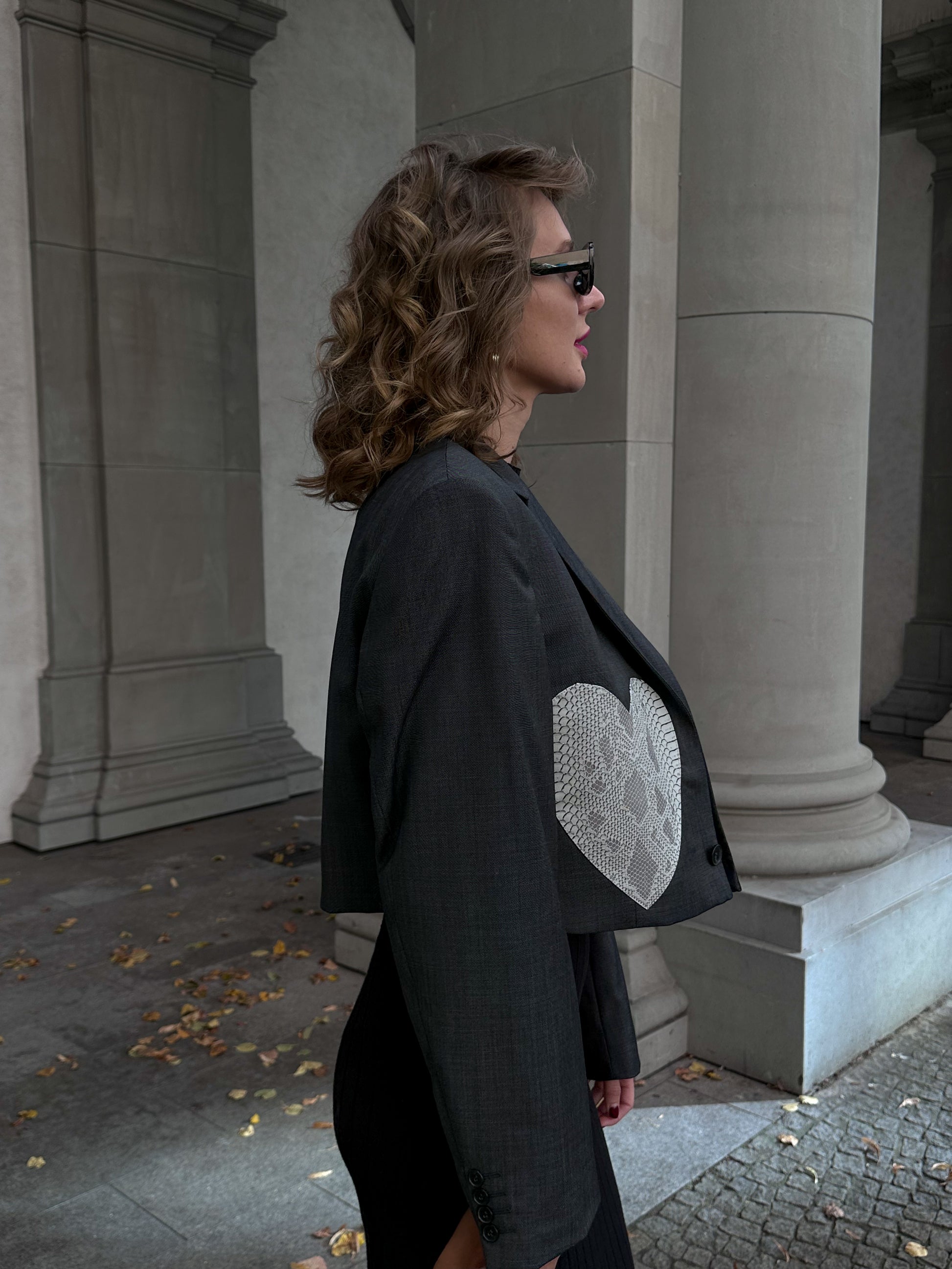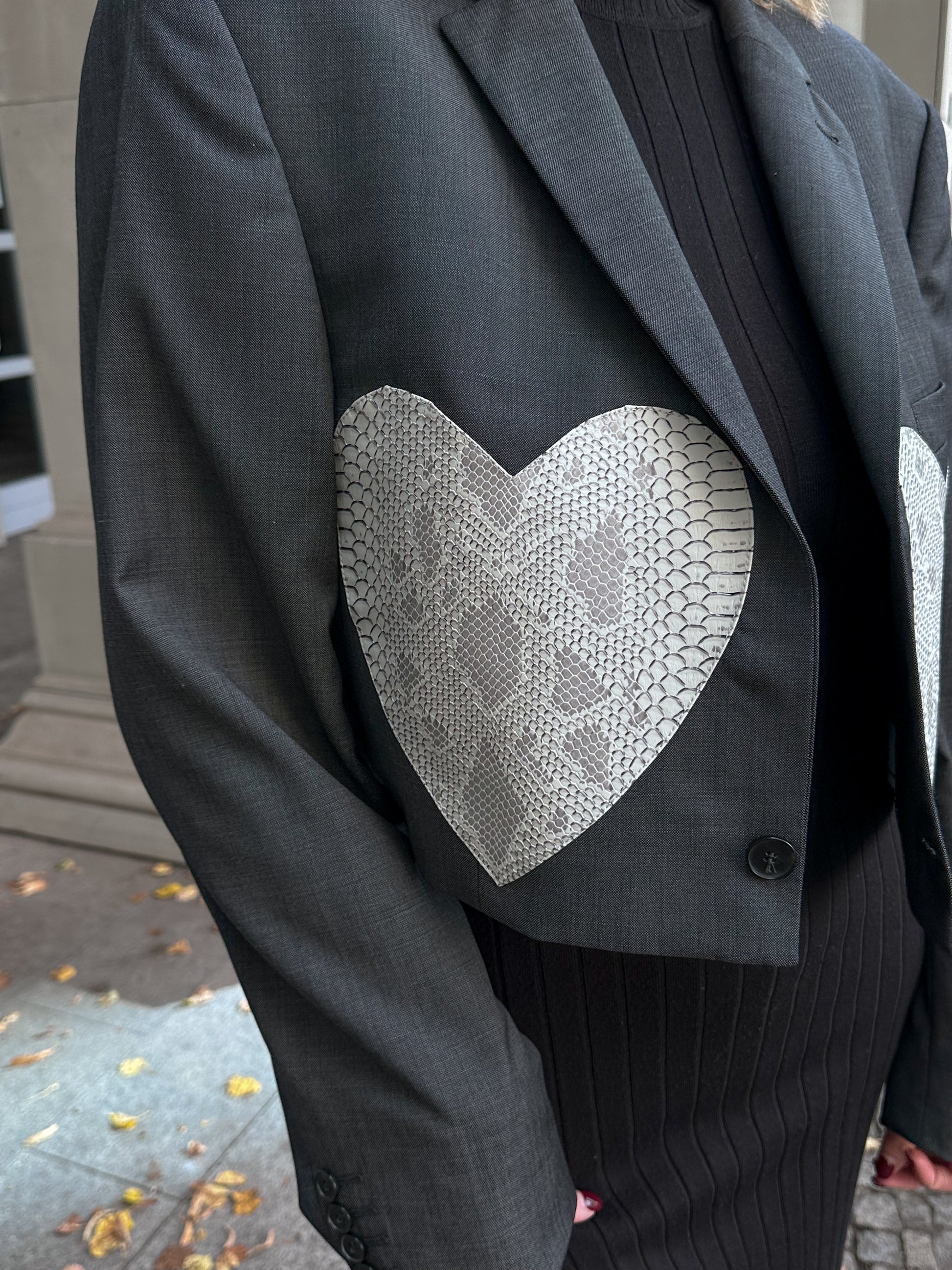 The CROPPED OVERSIZED BLAZER "SNAKE PEARLS" is the perfect blend of wool and cotton, making it incredibly comfortable for transition seasons. Adorned with big leather hearts, this blazer adds a flirty and chic touch to your wardrobe.