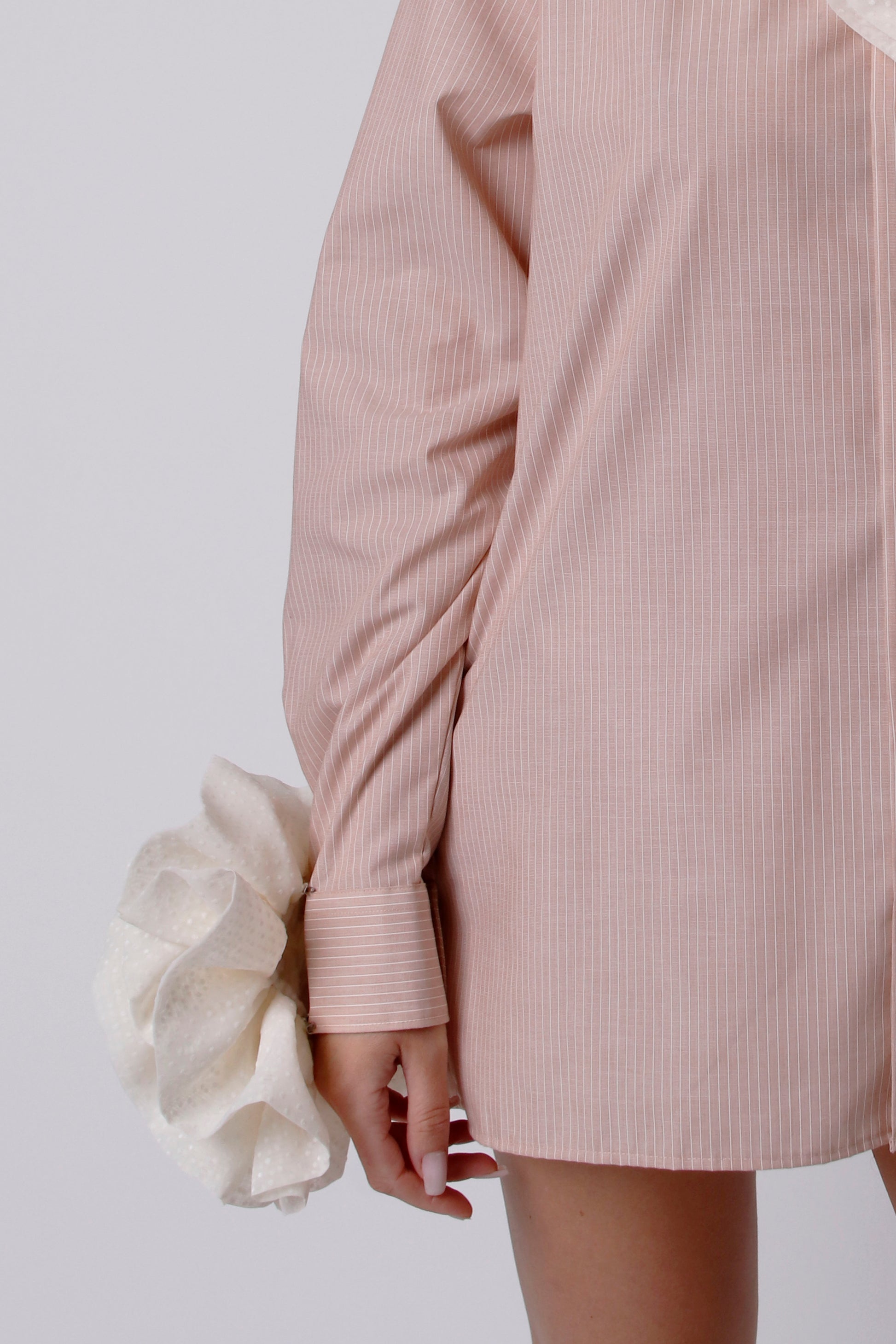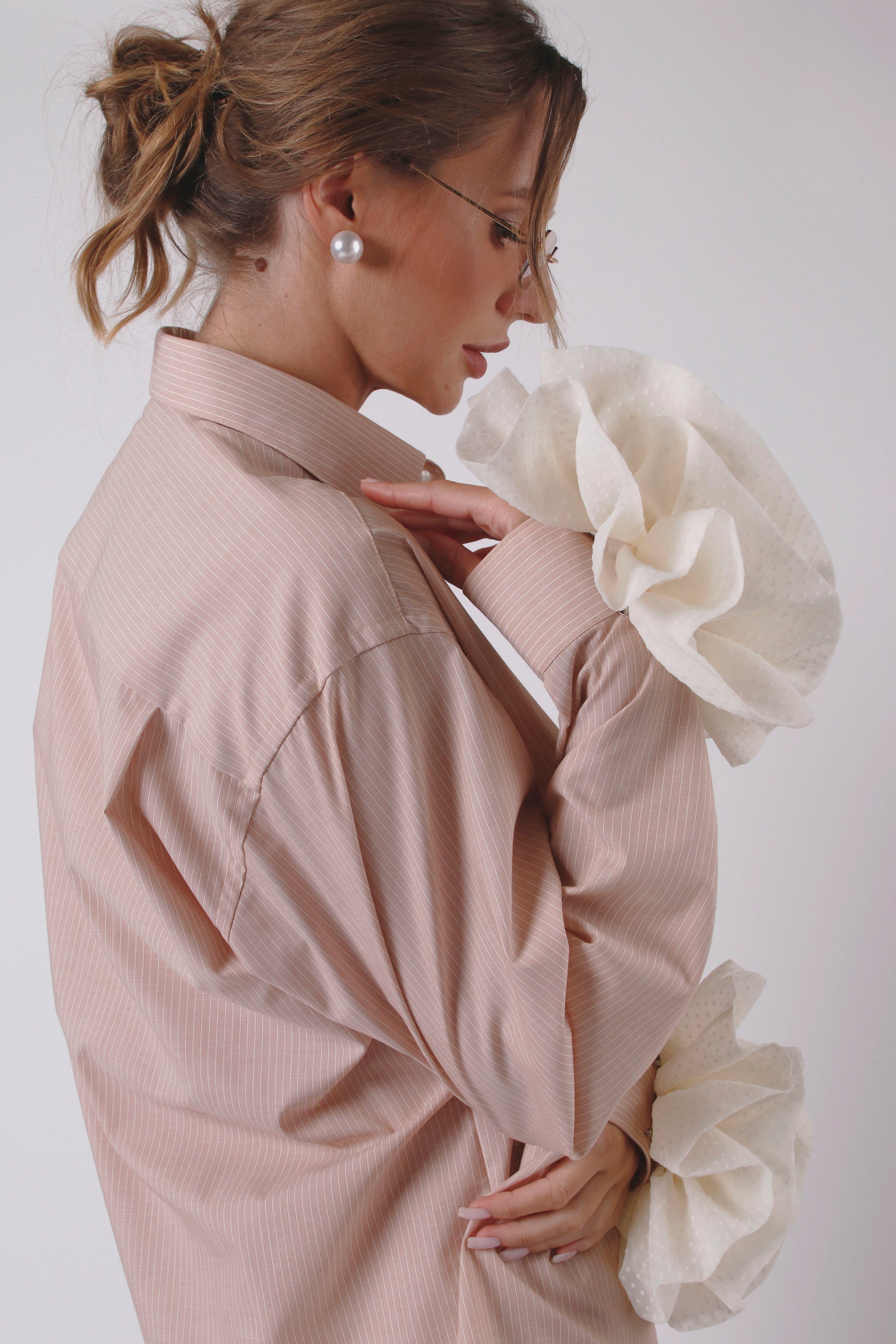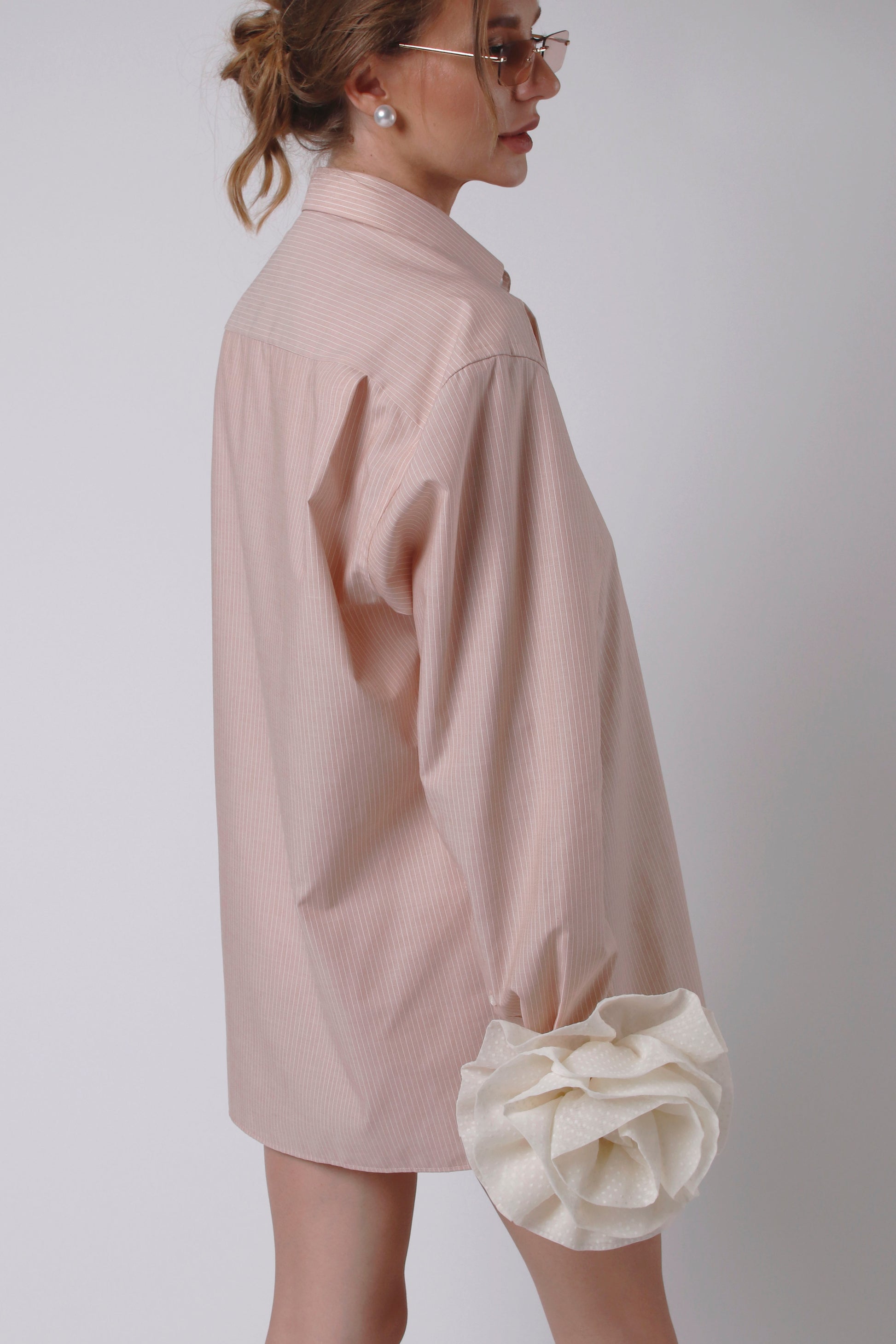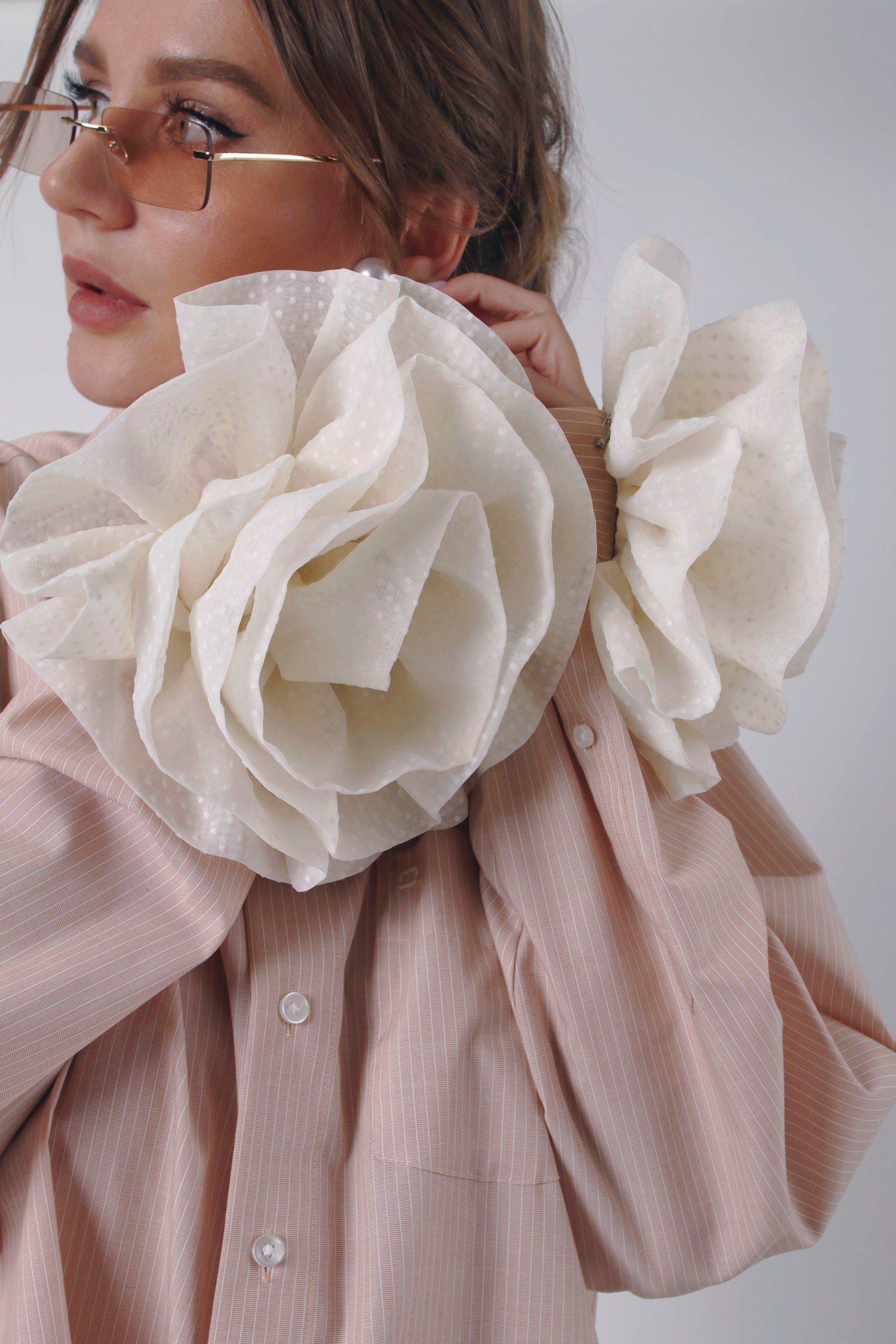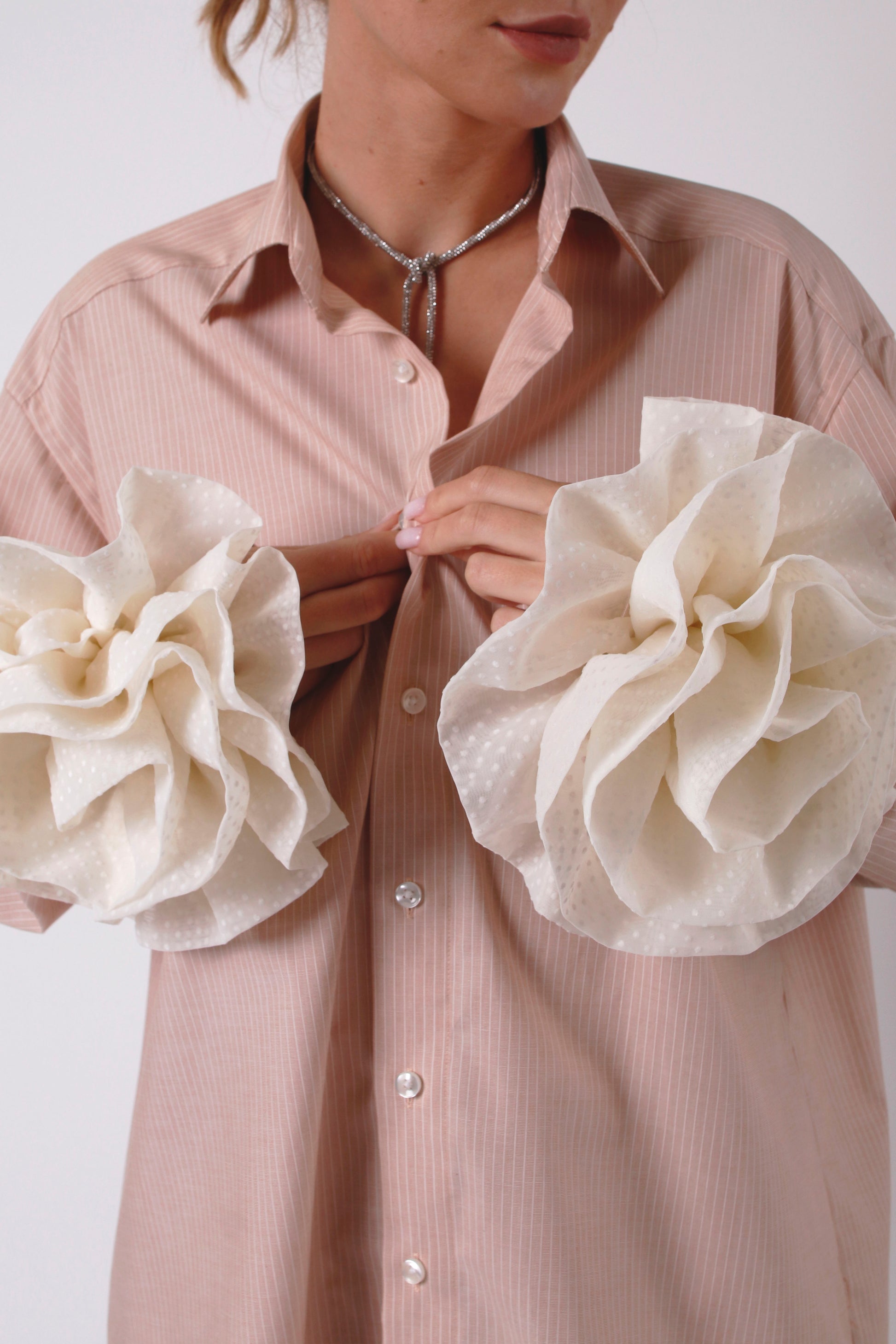 Chic upcycled cotton shirt in an elegant shade of rose gold. Featuring romantic removable flowers on the sleeves, this shirt offers two distinct looks. The detachable flowers allow you to switch between a bold, elegant style and a more subtle, sophisticated look. Perfect shirt to feel POSH!