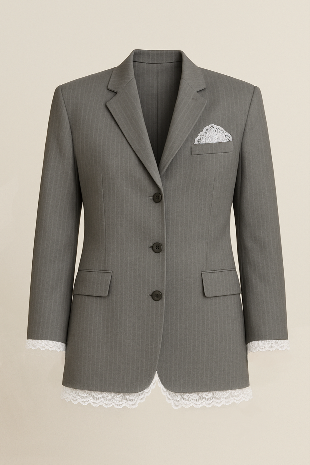 Elevate your wardrobe with our fine wool "Dusty Onyx" blazer. The high quality fabric exudes sophistication, while delicate lace accents add a touch of femininity.