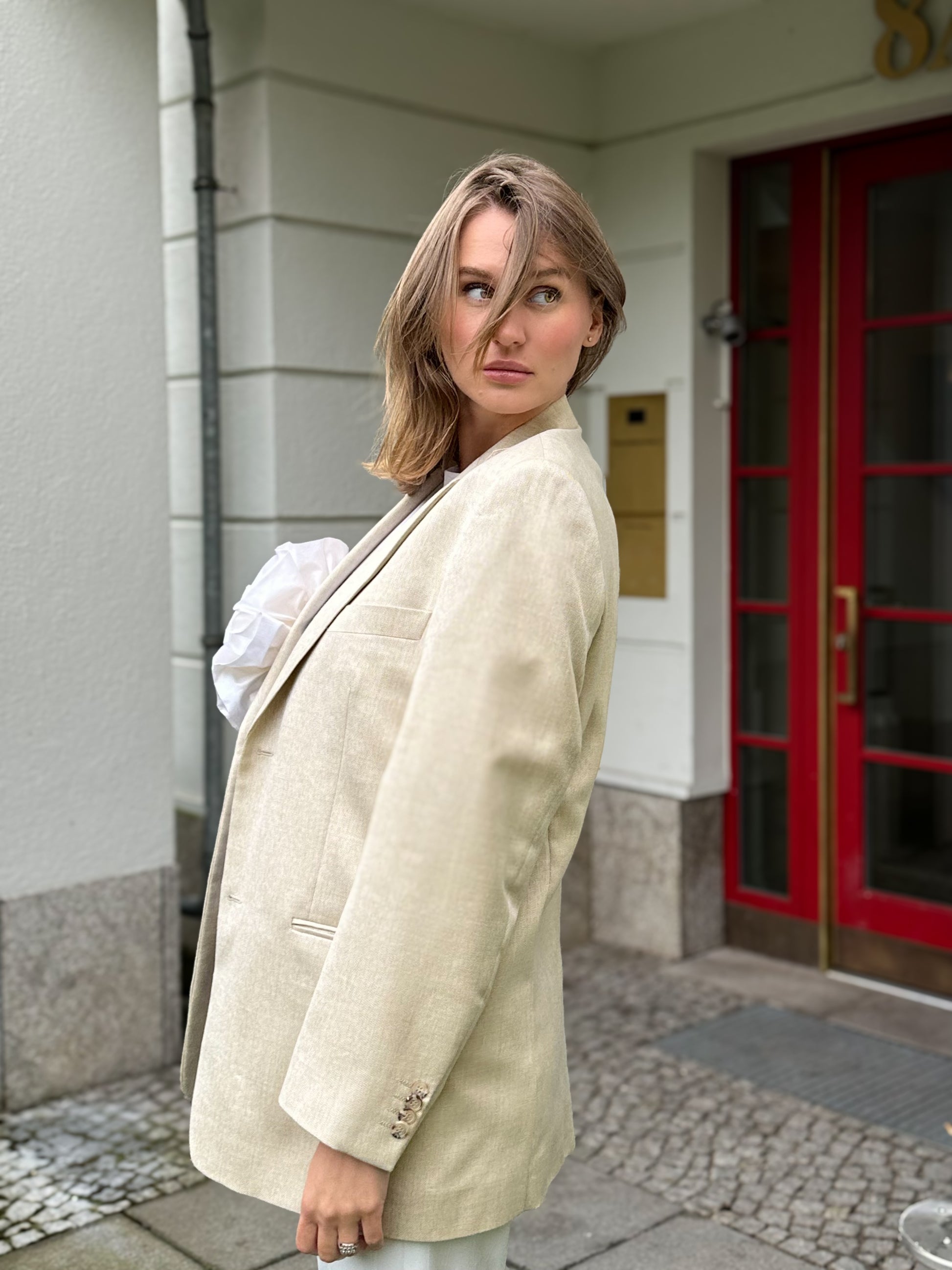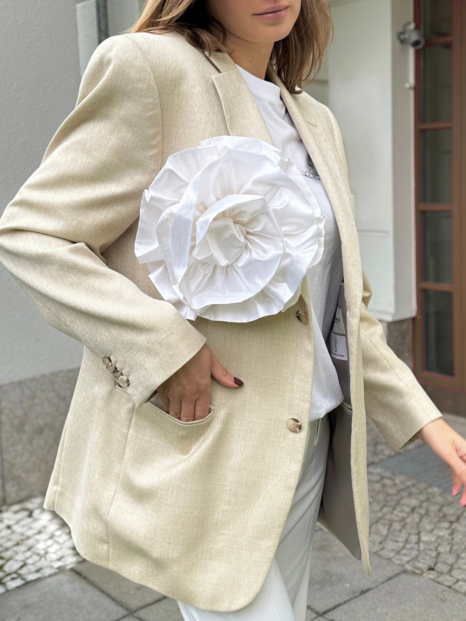 Oversized Blazer "Precious Perl" crafted with warm beige tones and adorned with a pearly white silk flower, this blazer exudes elegance and sophistication. Made with ultra-soft fabrics, it offers both style and comfort in one luxurious piece.