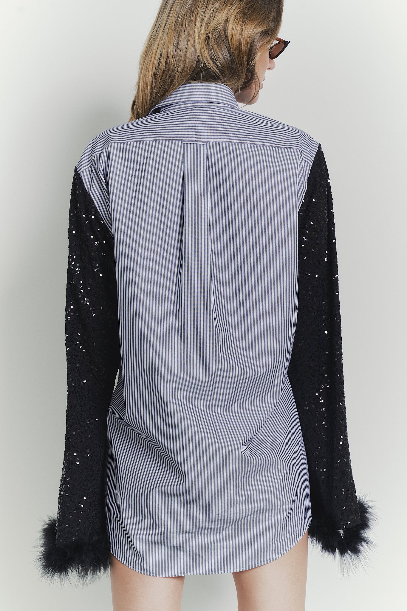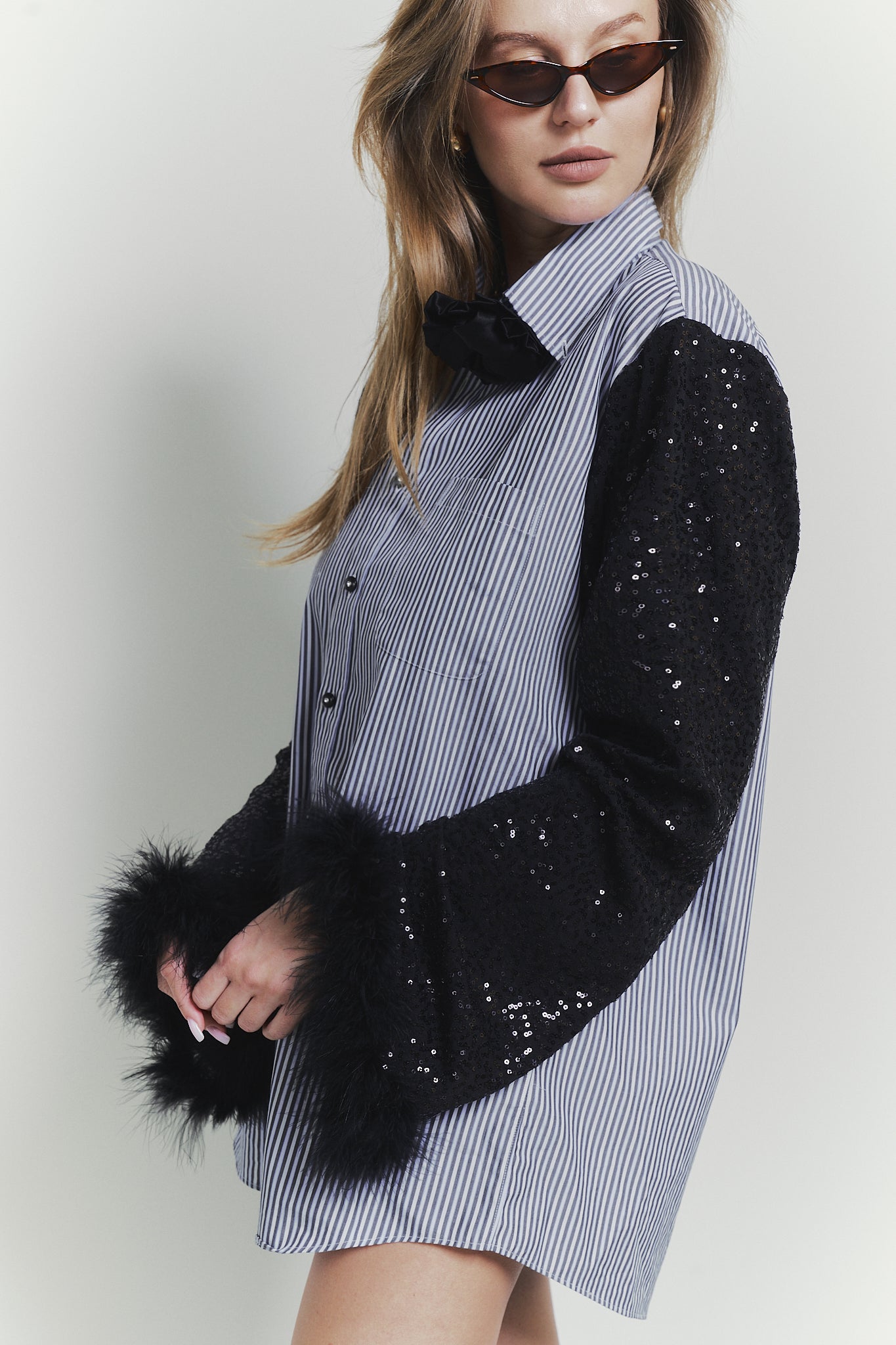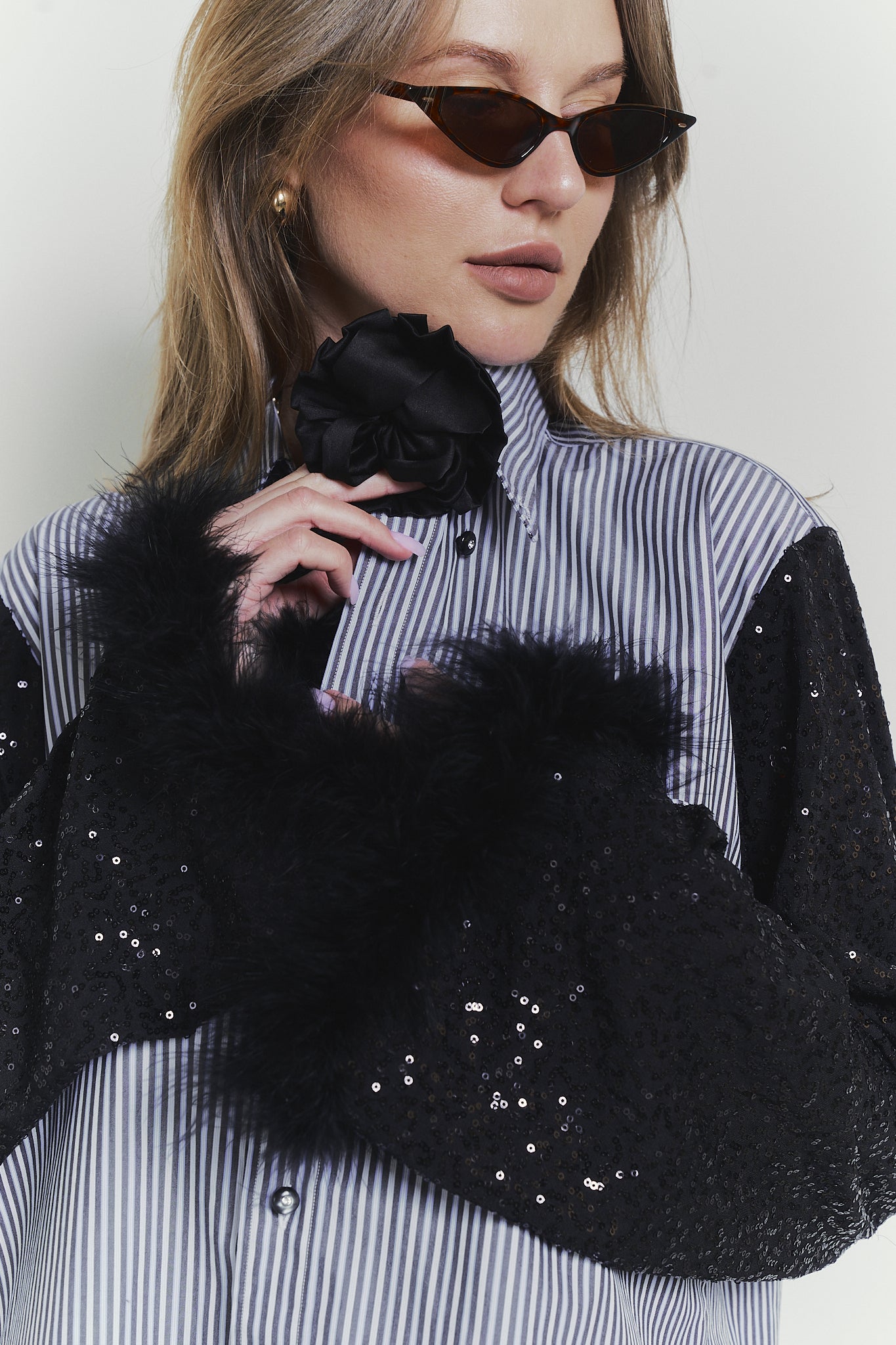 The BLACK HEART shirts are crafted with stunning shiny black sleeves and feather accents, making them the center of attention. Elevate your style with this eye-catching and unique piece.
