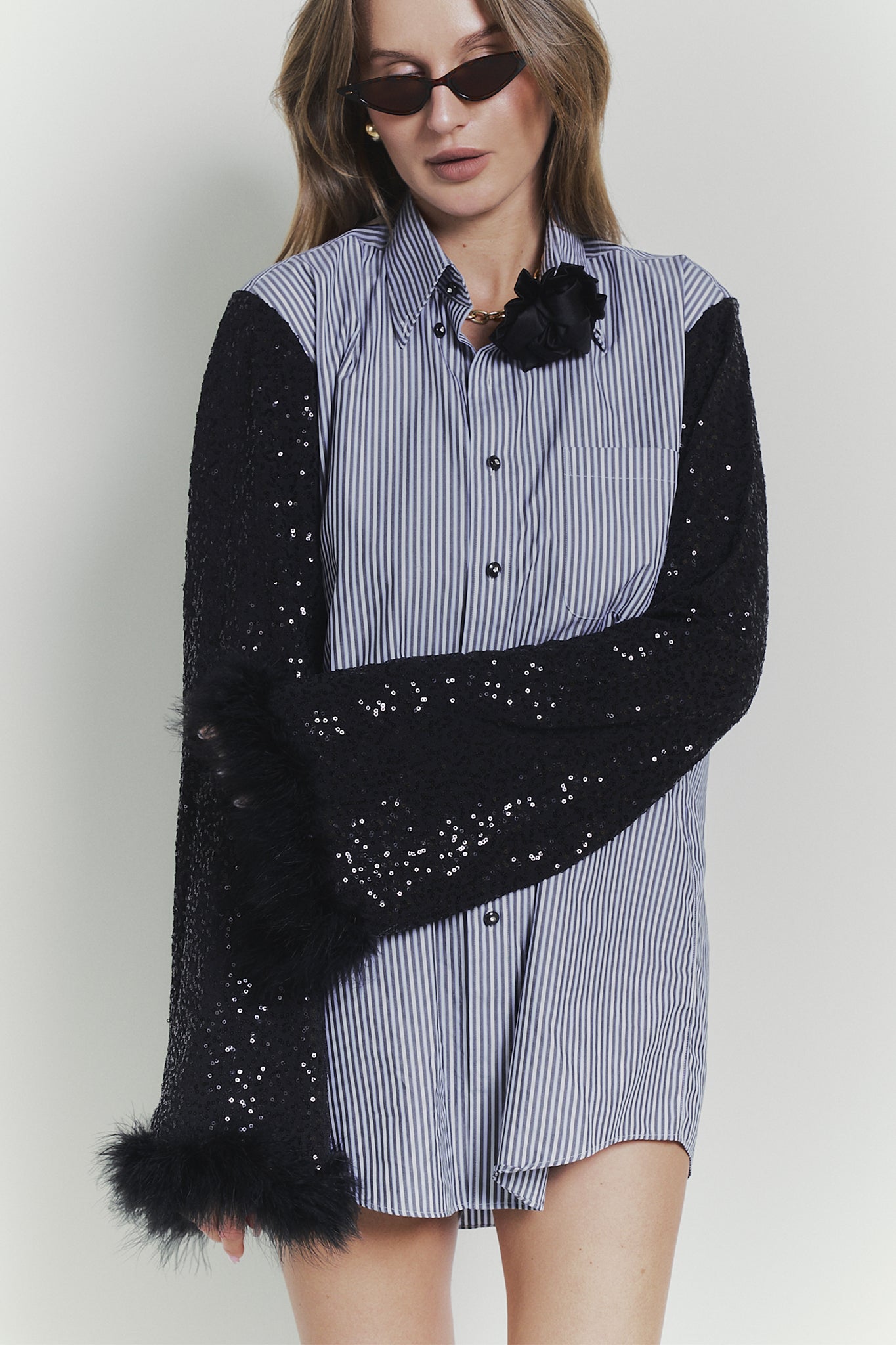 Elevate your style with the BLACK HEART shirt. This upcycled piece features romantic flower details and shiny sleeves, guaranteed to make you stand out. With this unique shirt, you'll be the center of attention at any event. Expertly crafted and environmentally conscious, embrace the perfect combination of sustainability and fashion.