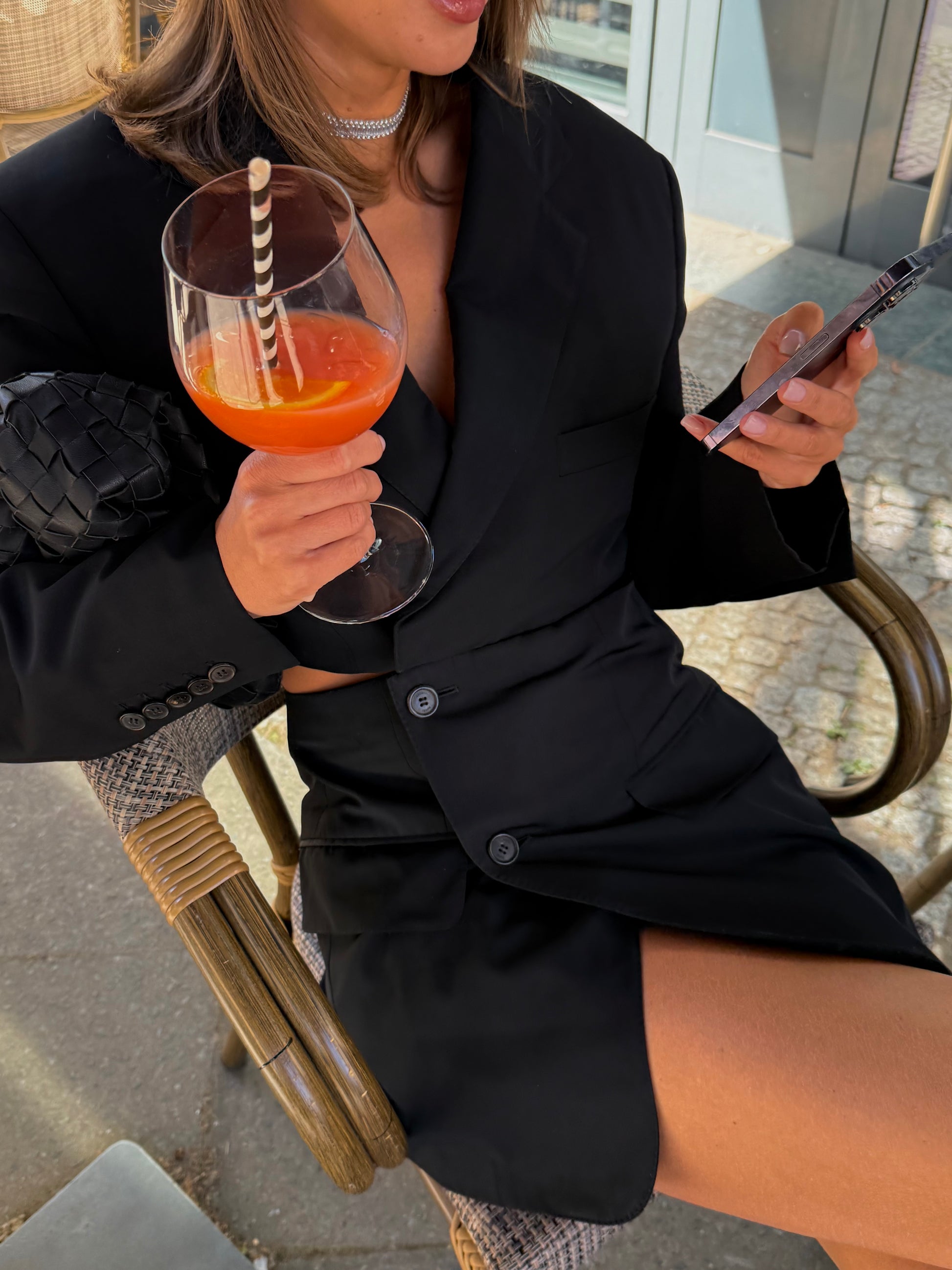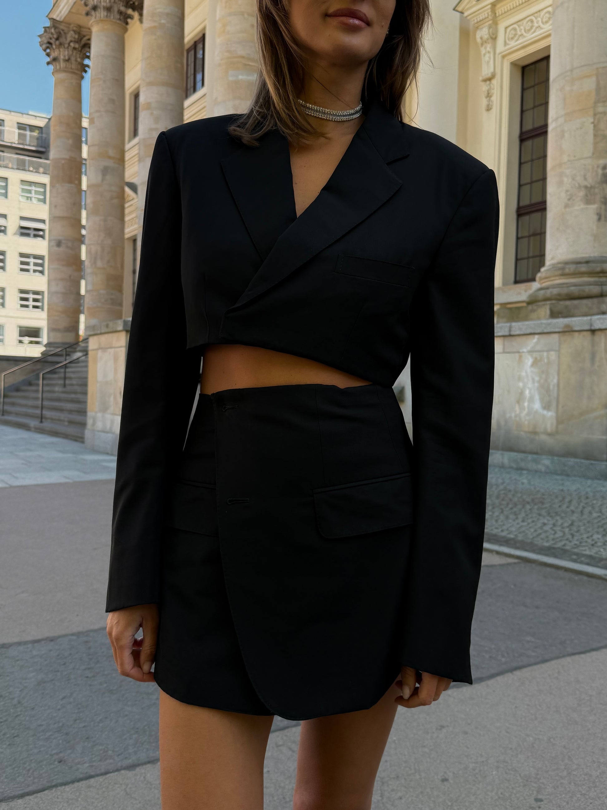 Introducing the Suit "BLACK JADE". Redesigned from the classic Gucci blazer, this two-piece suit features a cropped blazer and skirt. Elevate your style with this elegant and outstanding set.